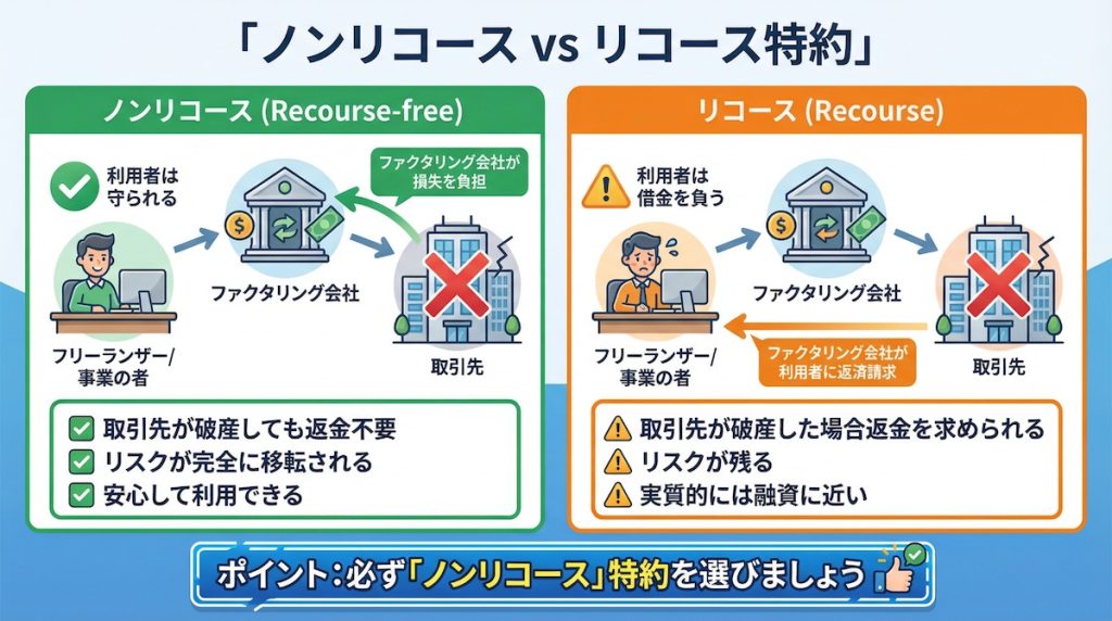 もし「リコース契約」や「償還請求権あり」となっていた場合、それは売掛先が倒産した際にあなたが返済義務を負う、実質的な「借金」と同じです。絶対に契約してはいけません。