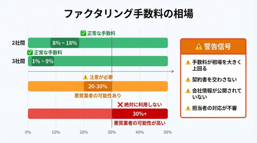 ファクタリングの手数料には、ある程度の相場が存在します。これを大きく逸脱する手数料を提示された場合は、悪質な業者である可能性を疑うべきです。
