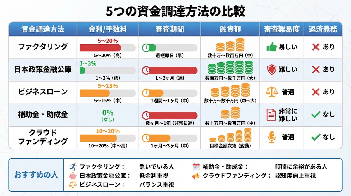 | 項目 | ファクタリング | 日本政策金融公庫 | ビジネスローン | 補助金・助成金 | クラウドファンディング |