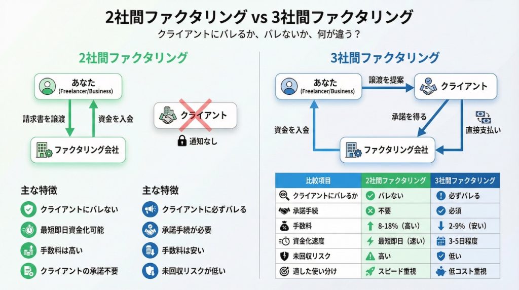 まず大前提として、ファクタリングには2つの種類があり、どちらを選ぶかで「バレる・バレない」が根本的に決まります。